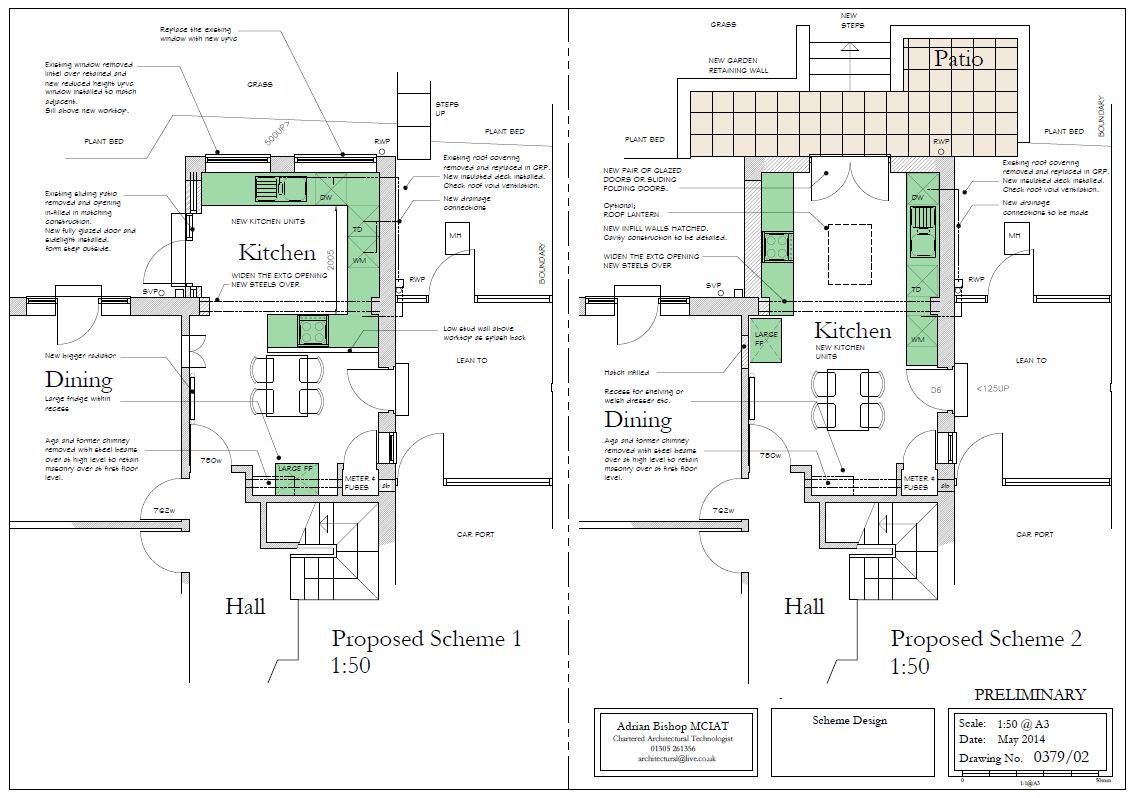 Proposed alterations to an existing kitchen. Choice of two schemes to improve the layout of the kitchen within the existing space. Which do you prefer?