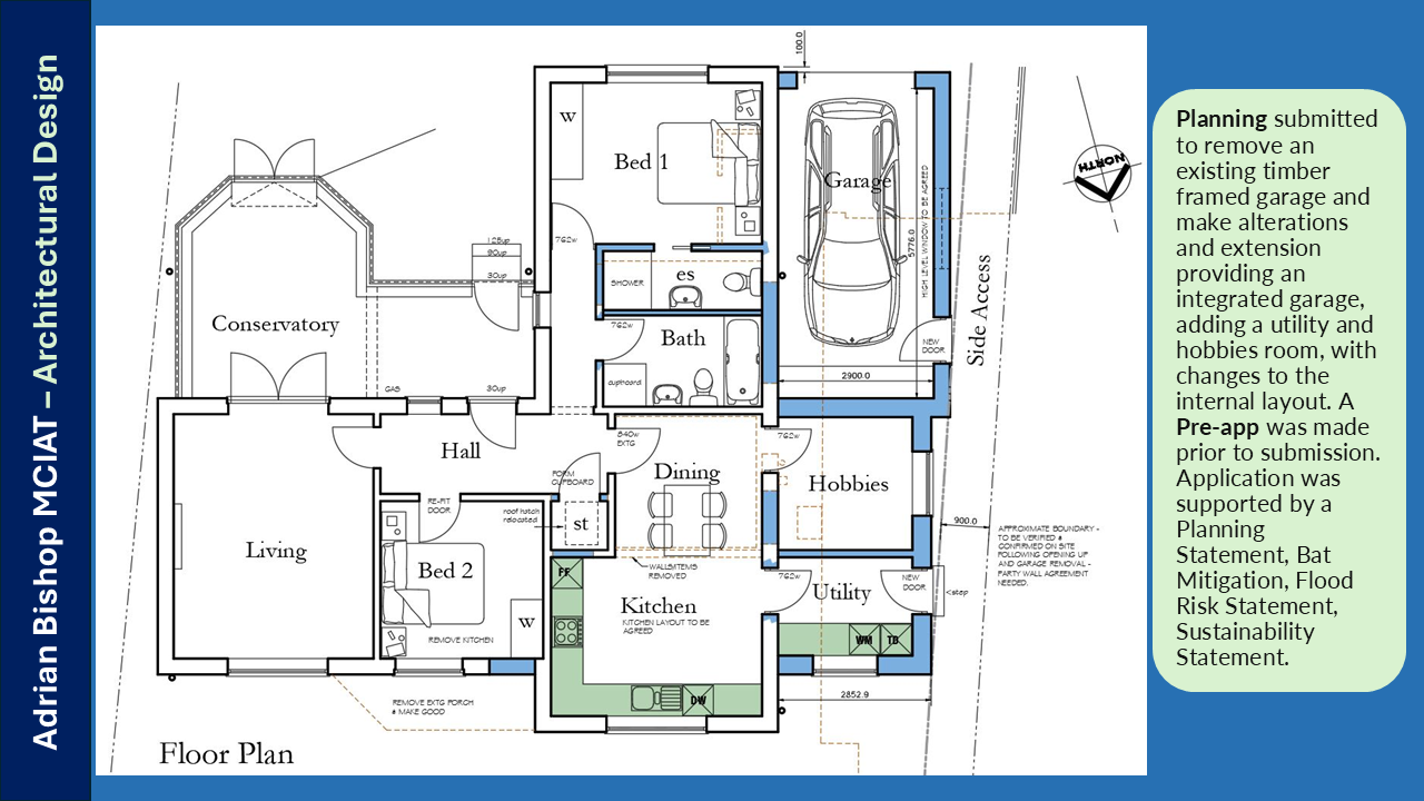 Planning submitted to remove an existing timber framed garage and make alterations and extension providing an intergrated garage, adding a utility and hobbies room, with changes to the internal latout. A Pre-app was made prior to submission. Application was supported by a Planning Statement, Bat Mitigation, Flood Risk Statement, Sustainability Statement.