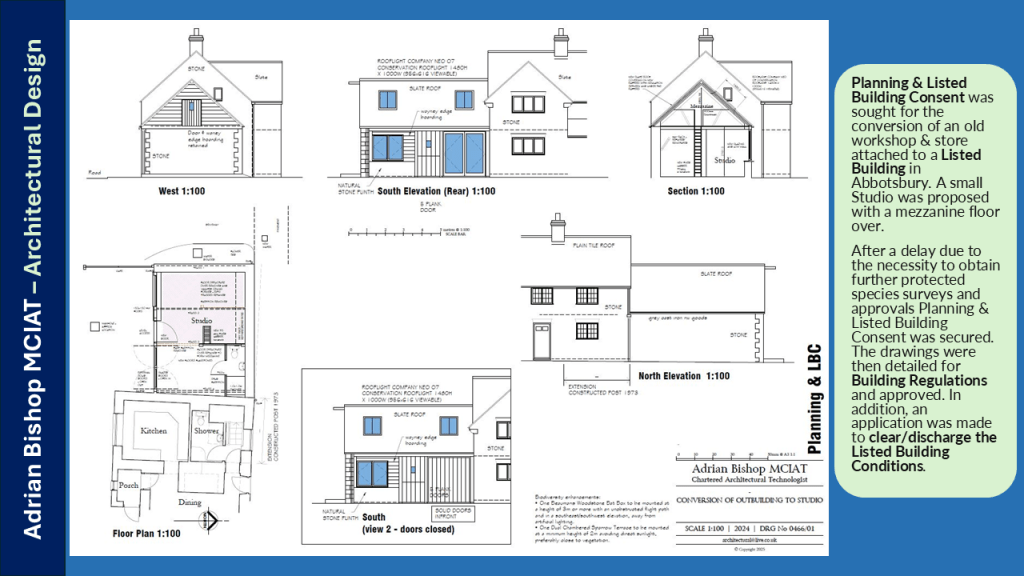 After a delay due to the necessity to obtain further protected species surveys and approvals Planning & Listed Building Consent was secured. The drawings were then detailed for Building Regulations and approved. In addition, an application was made to clear/discharge the Listed Building Conditions.