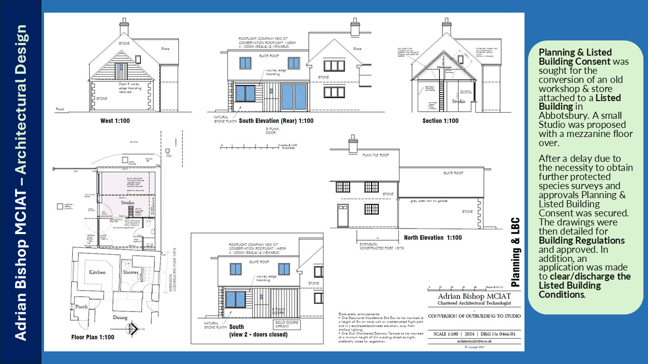 Planning & Listed Building Consent was sought for the conversion of an old workshop & store attached to a Listed Building in Abbotsbury. A small Studio was proposed with a mezzanine floor over.